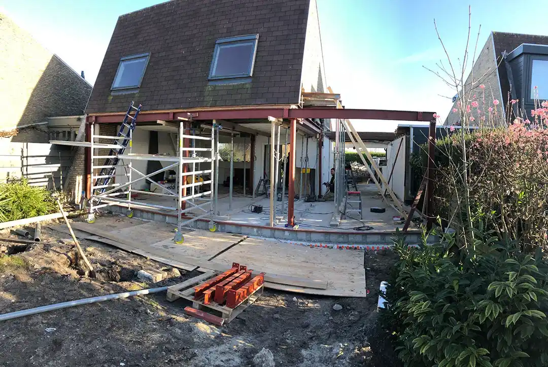 Om de vakantiewoning om te bouwen naar een woonhuis met veel ruimte, werd een deel van de buitenwanden weggehaald. Op deze manier konden we de woning uitbouwen. De uitdaging zat vooral in de staalconstructie. Deze zou een halve verdieping gaan tillen en de kolommen van de staalconstructie moesten precies gelijk vallen met de stijlen van het kozijn.